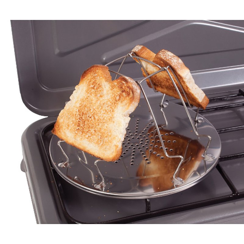 If you want to cook more than one piece of toast at a time this is the best toaster that sits on top of your camp stove. It easily folds flat to be put away and you can assemble it in seconds. It can hold 1-4 slices at one time.