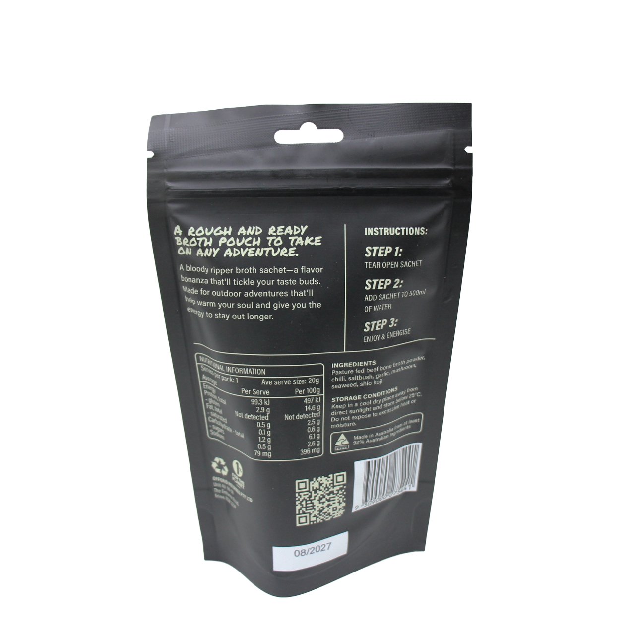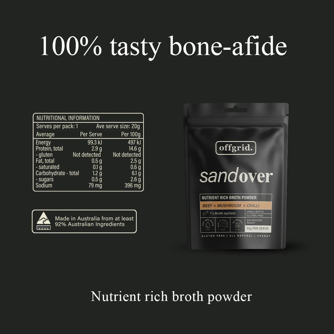 lightweight nutrient rich broth sachets, perfect for packlite hiking, hunting and mountaineering. Made with Pasture fed beef, seaweed, chilli, dried shitake mushroom and shio koji for added umami punch.  Simply add hot water and mix well.