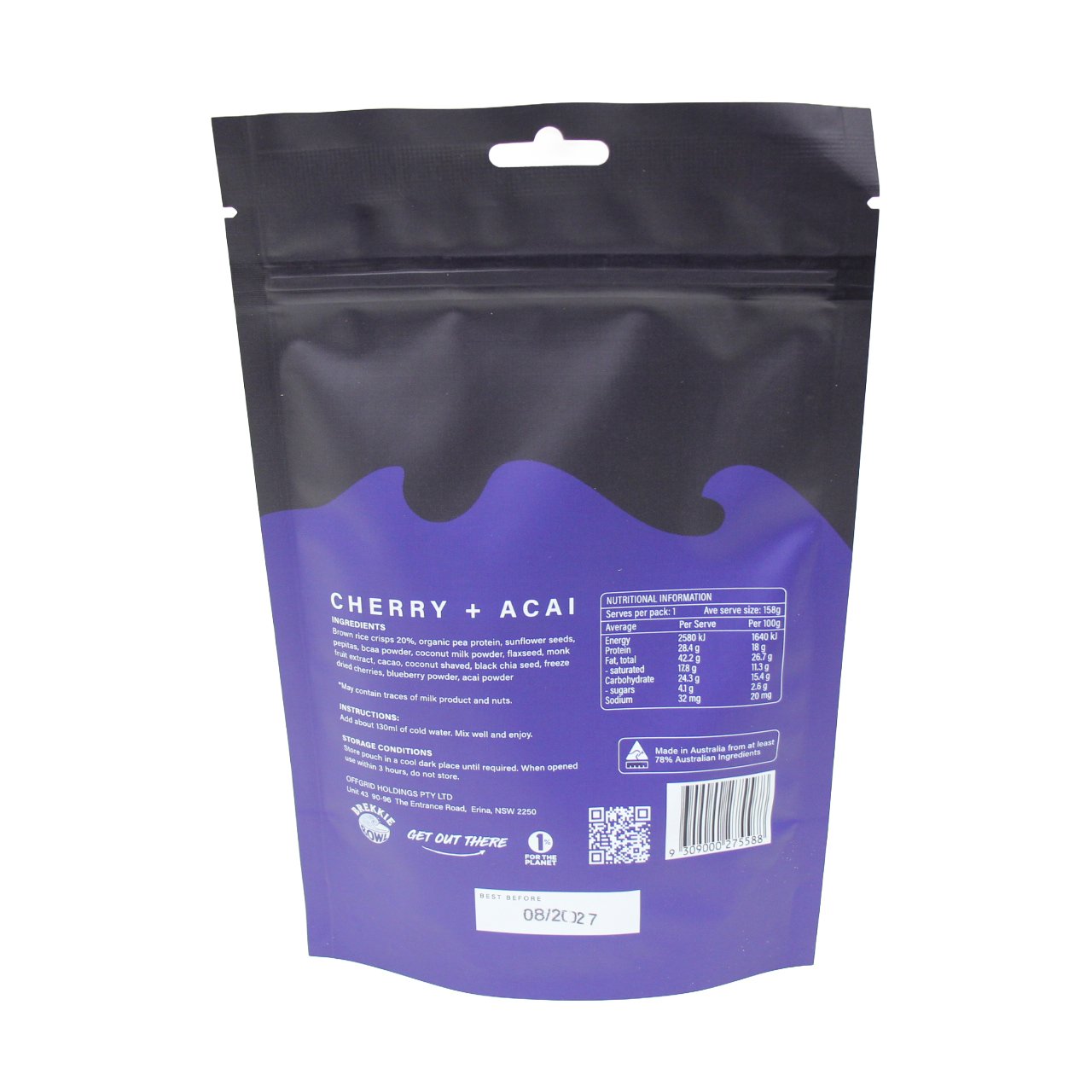 Offgrid plant based PERFORMANCE SERIES brekkie bowls are formulated for the early bird on the go. Packed with goodness, with added BCAA's to reduce muscle fatigue, organic pea proteins to keep you at your best and each recipe is made with natural fruits, assorted seeds, toasted grains and superfoods. Supercharge your day - just add water Shelf stable, gluten free, perfect for camping, 4wd touring, hiking, fishing.