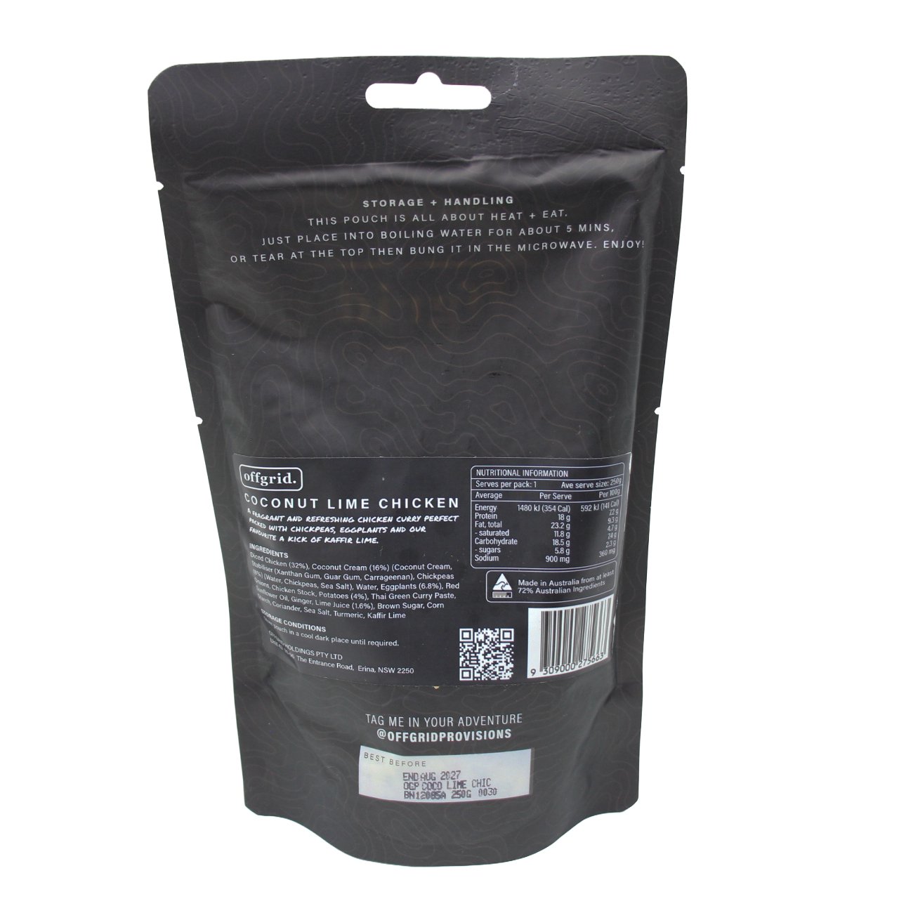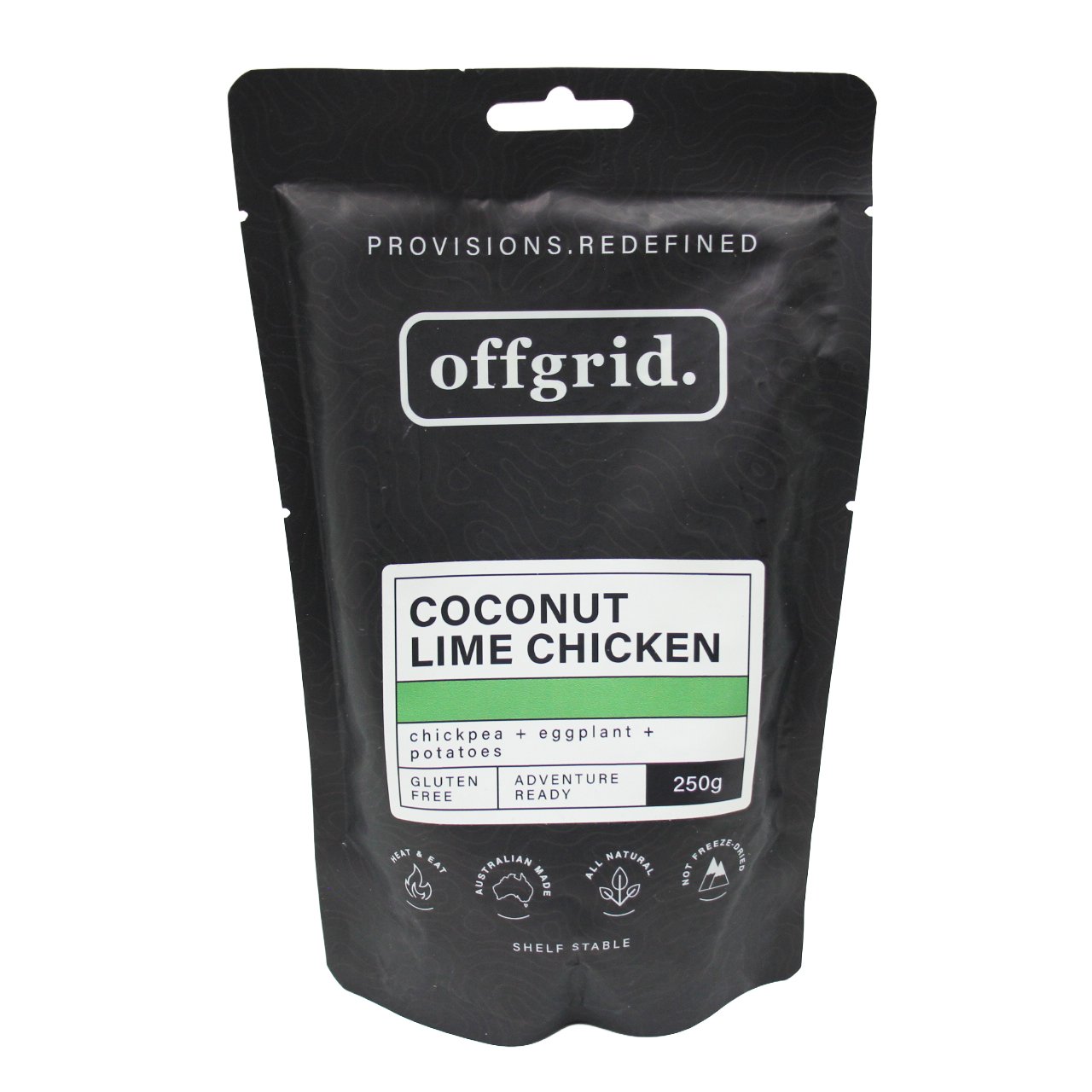 A fragrant and refreshing chicken curry packed with chickpeas, eggplants and our favourite, a kick of kaffir lime, elevate your offgrid hike, camping session with your mates or just keep it in the cupboard at home for the nights when simply cant be bothered to cook.