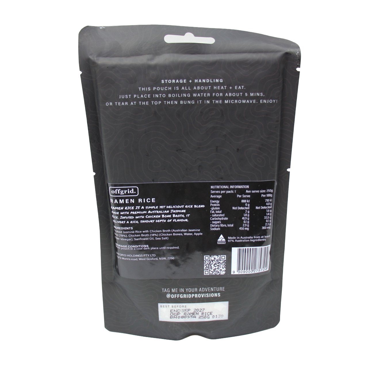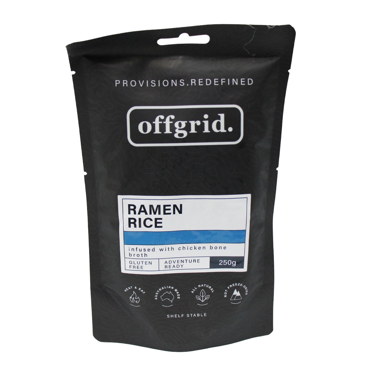Quick, tasty, and ready to go! Offgrid Ramen Rice is jasmine rice cooked in fragrant ramen stock—toss it into any dish for instant flavour. Shelf stable, gluten free, and perfect for camping, touring, or home cooking.