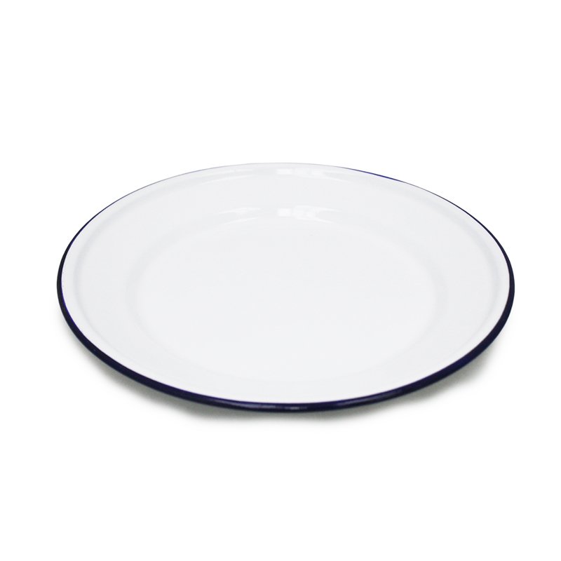 White enamel flat plates. Just as at home on a campsite as in a cafe.