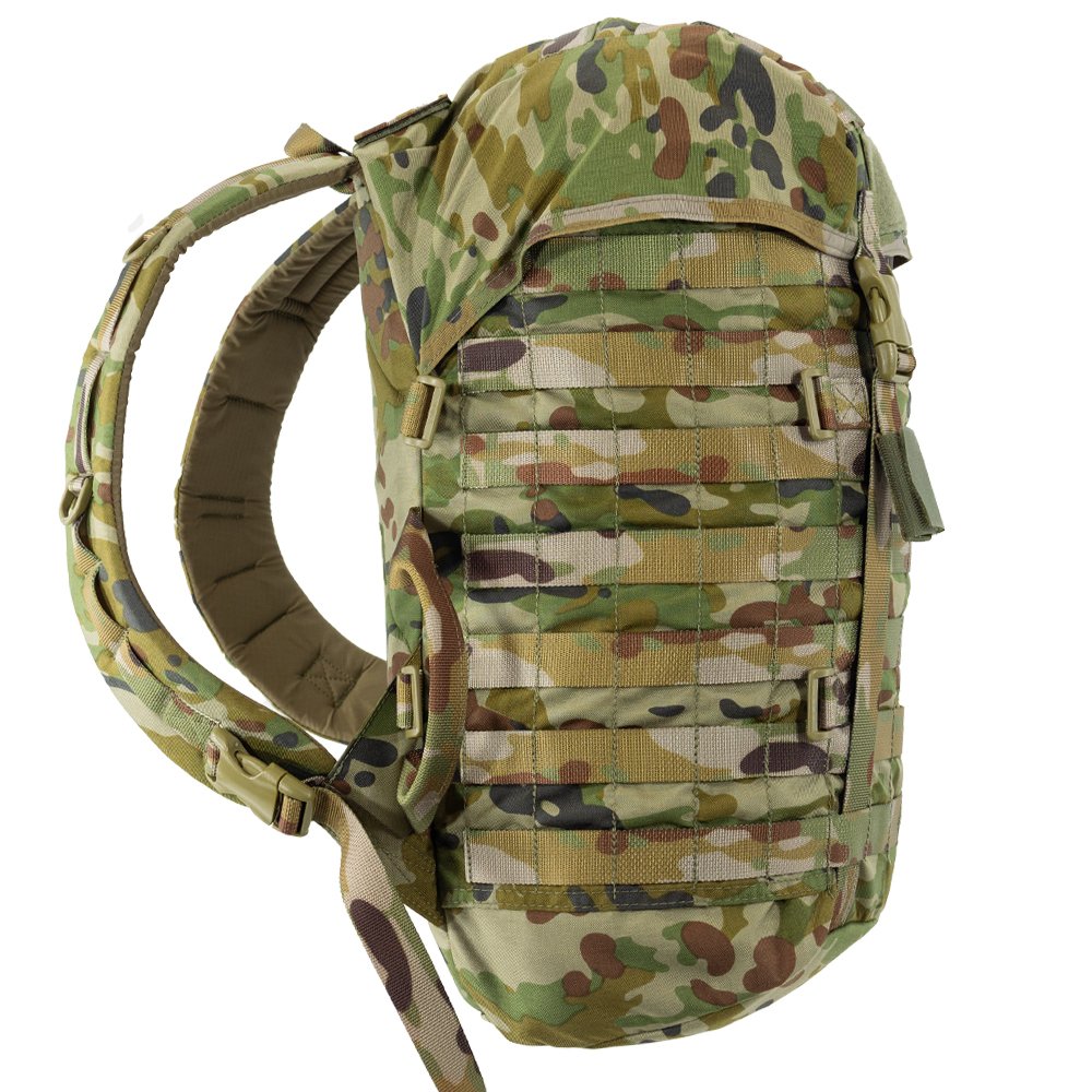 The tubular internal compartment has a dry bag style roll top closure minimising the amount of water and moisture entering the pack in wet climates that will damage equipment much faster in any standard zip pack. While not water proof, in an amphibious or tropical environment this feature makes a big difference. The same applies for hot arid dusty areas where dust and silt find their way into everything. Under the lid is a single small mesh pouch with sturdy zip closure, ideal for miscellaneous items.