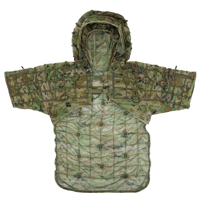 Featuring a double hood to reduce head movement signature, 550 Paracord grid and Elastic loops for local camouflage/scrim.
