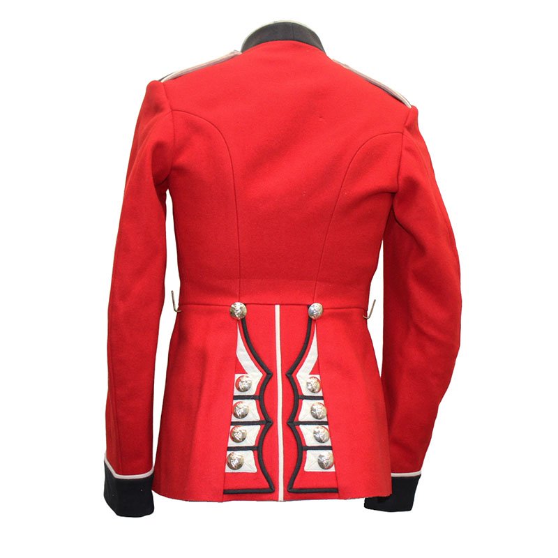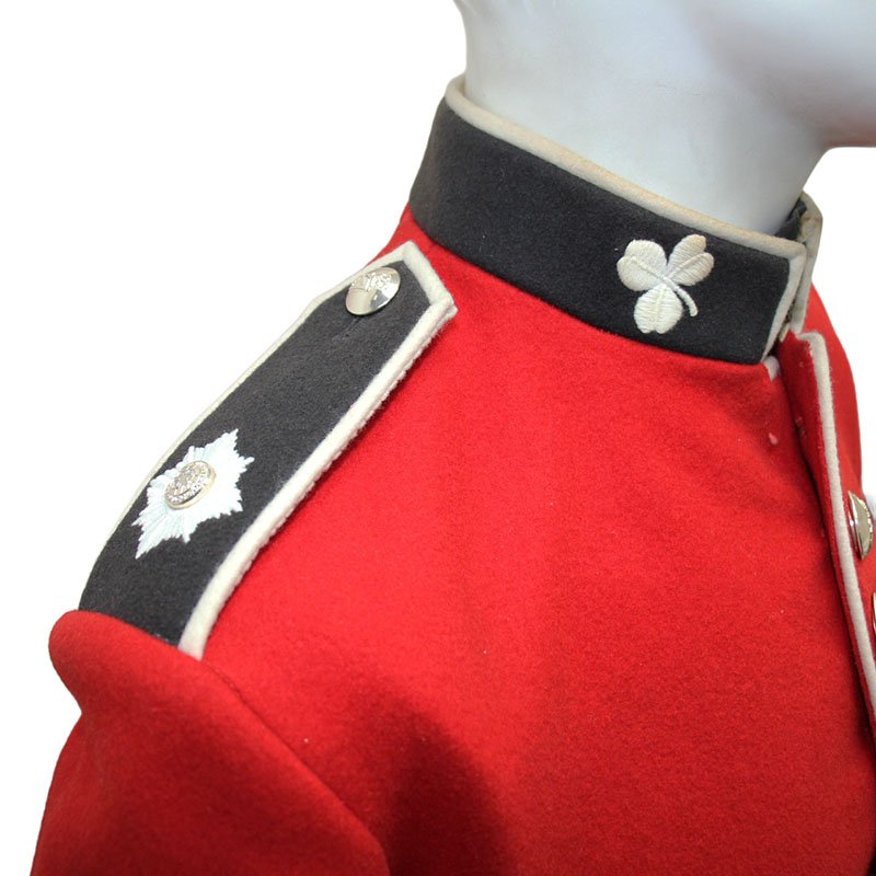 Like the other Foot Guards regiments, the "Home Service Dress" of the Irish Guards is a scarlet tunic and bearskin. Buttons are worn in fours, reflecting the regiment's position as the fourth most senior Guards regiment, and the collar is adorned with embroided shamrock.