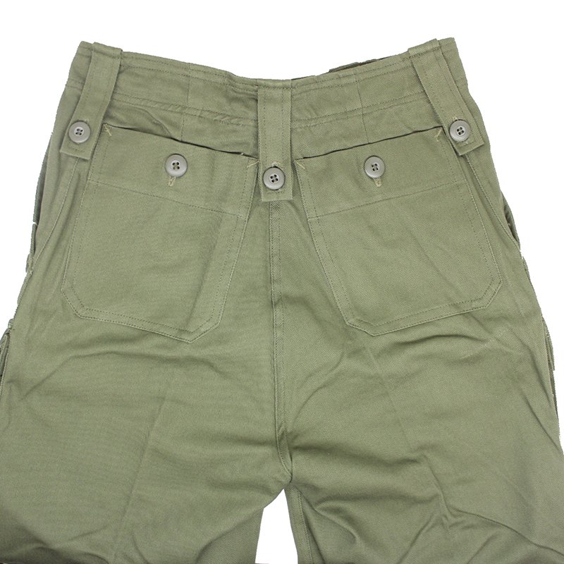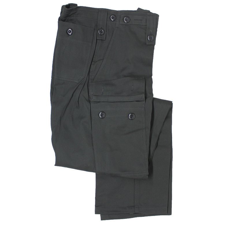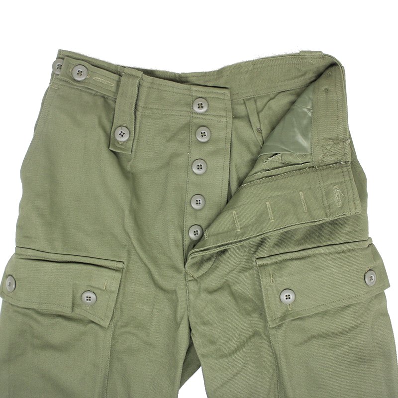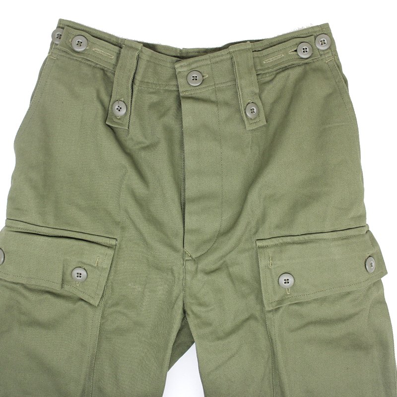 The fly, belt loops and waist adjusting straps are all equipped with buttons. For utility the trousers have 2 deep waist pockets, 2 buttoned cargo pockets and 2 rear open topped pockets with a single button closure. The groin and knee areas lack any reinforcing in favour of keeping the pants lighter for use in hot jungle environments.