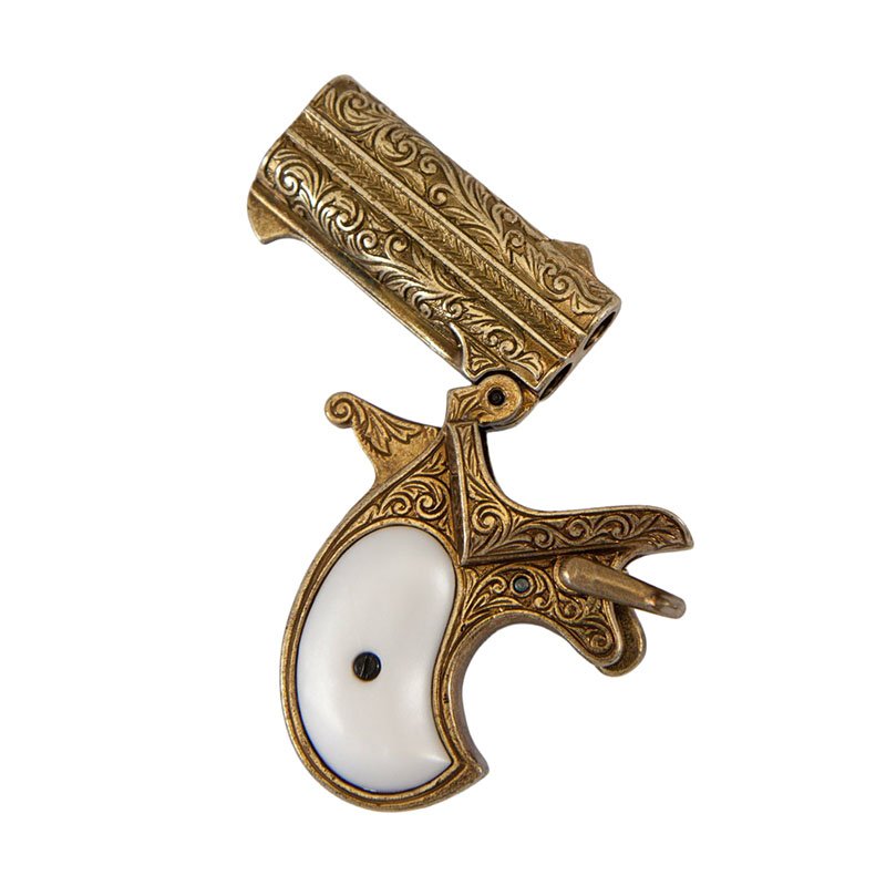 The Remington Model 1866 double-barrel derringer, which was chambered for the .41 rimfire cartridge. This pistol was designed by William Elliot for Remington and became a popular concealed handgun, frequently used by gamblers, women, and others who needed a discreet firearm.