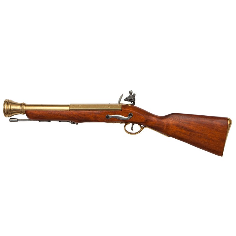 Blunderbusses were typically very short, with barrel less than 60 cm of length, at the same time, musket's barrel measured more than 90 cm. The firing mechanism was based on a flint or flint stone, which the hammer produced the spark that ignited the gunpowder.