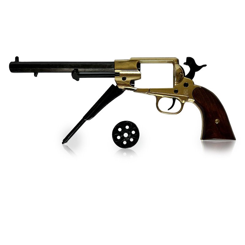 As cap-and-ball revolvers became outdated, many models were adapted to fire metallic cartridges. Kolser faithfully recreates the Remington 1858 Converted, featuring a modified cylinder and rear-positioned hammer. This replica is not just decorative: it’s designed with a functional mechanism that reproduces the original firearm’s movements simulated firing..