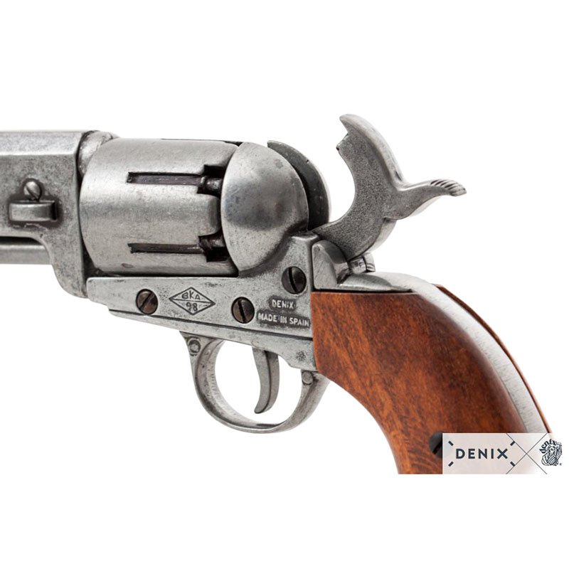 Imitation of a revolver from the American Civil War, made of metal and wood, featuring a simulated loading and firing mechanism and a rotating cylinder.