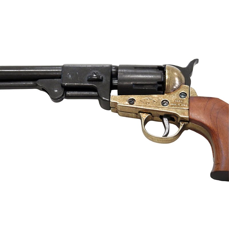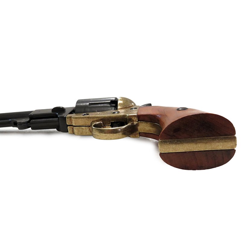 Imitation of a revolver from the American Civil War, made of metal and wood, featuring a simulated loading and firing mechanism and a rotating cylinder.