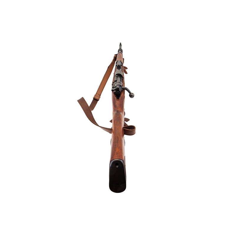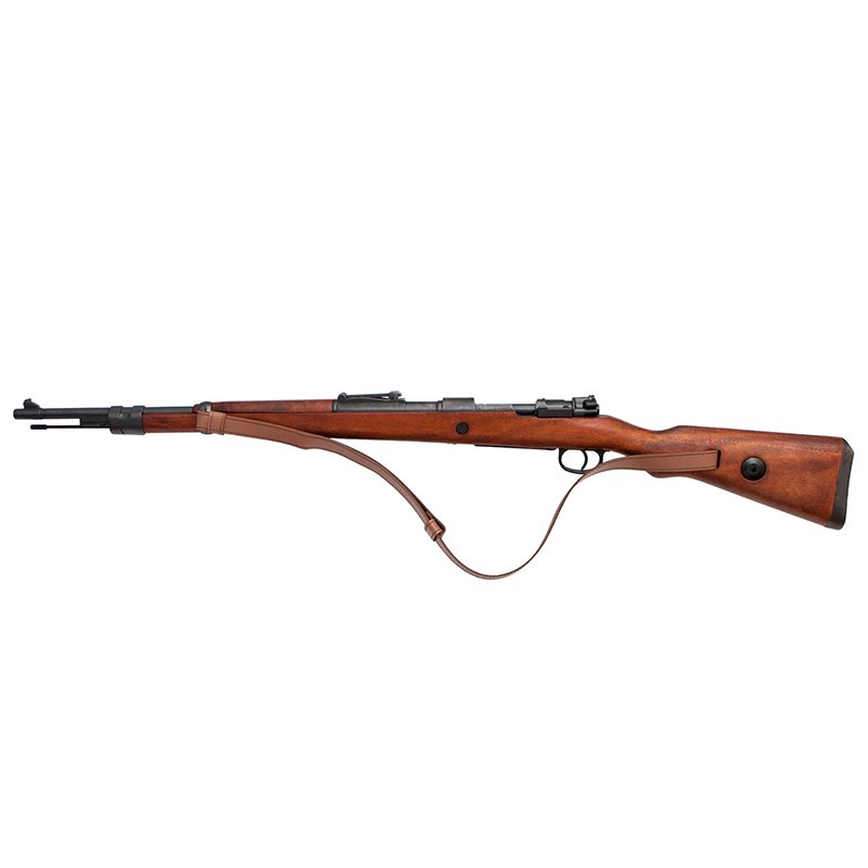 Replica of the Mauser 98K carbine, made of metal and wood, with simulated loading and firing mechanism, functional bolt, and leather sling.
