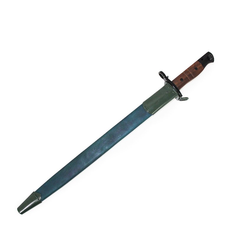 Perfect for your P14, P17 or shotgun with ventilated heat shield & bayonet lug. Steel blade with wood grips coupled with leather scabbard. Has metal tip and throat as used in WWI. Blade is made of 8Cr14MoV steel and approximately 17" long with a honed edge. These are new manufacture with markings on ricasso and scabbard.