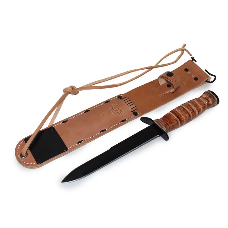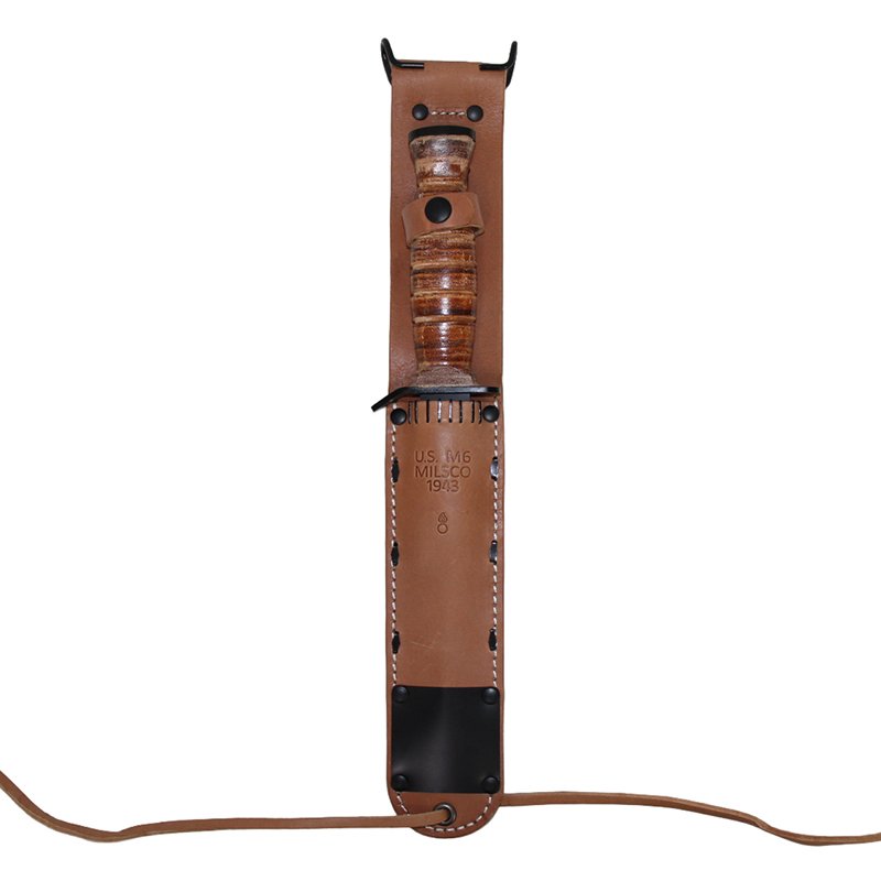 The M3 was initially issued with a stitched and riveted leather M6 scabbard with a protective steel tip designed to prevent the point from piercing the sheath and injuring the wearer.