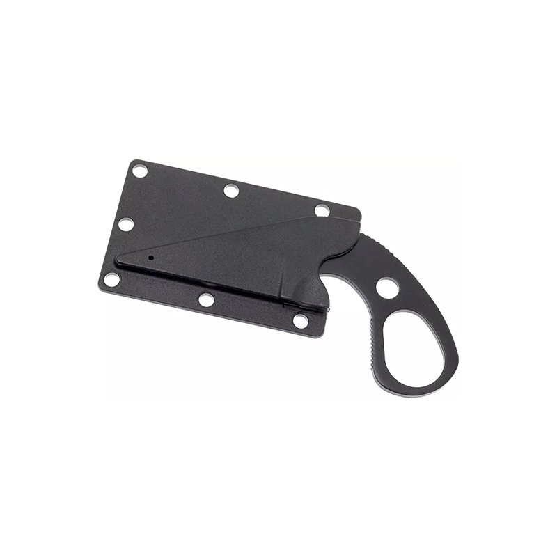 The KA-BAR Last Ditch Knife is a compact knife, intended as a last resort. The knife comes with a plastic sheath, enhanced with a couple lanyard eyes. This sheath was designed by KA-BAR to be attached to army boots, on top of the lace part.