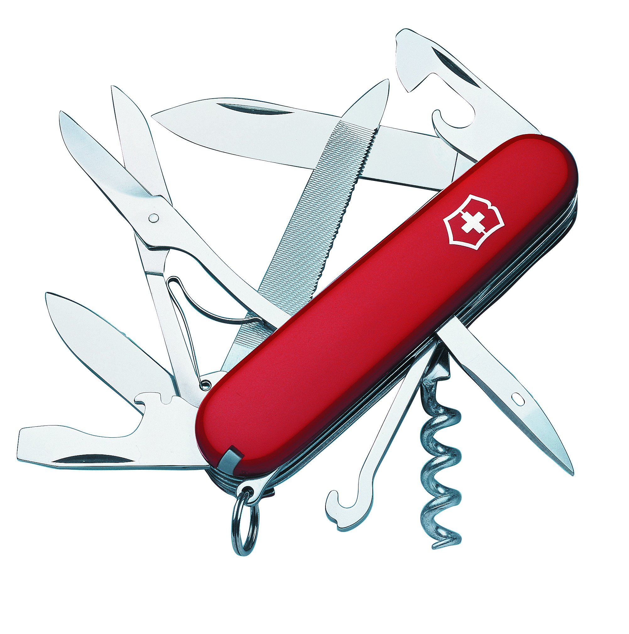 - 18 Tools: large blade, small blade, can opener, screwdriver 3 mm, bottle opener, screwdriver 6 mm, wire stripper, reamer, punch and sewing awl, corkscrew, scissors, nail file, nail cleaner, metal saw, metal file, multipurpose hook, toothpick, tweezers, key ring